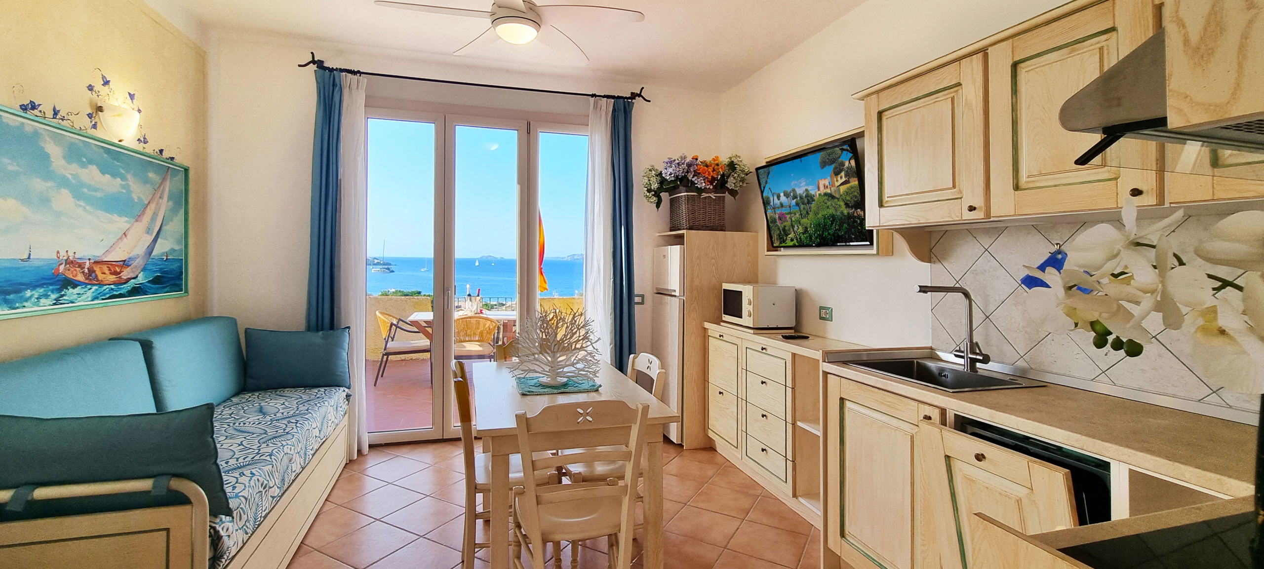 Una attrezzata terrazza con vista mare e/o giardino consente di vivere questi appartamenti sia all’esterno che all’interno.