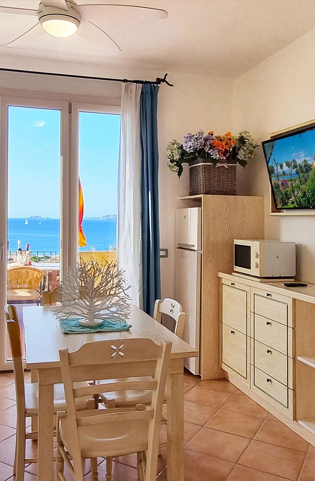 La presenza dei ventilatori a soffitto in tutte le stanze e dei condizionatori (su richiesta) garantisce un soggiorno gradevole anche nei mesi più caldi della stagione.